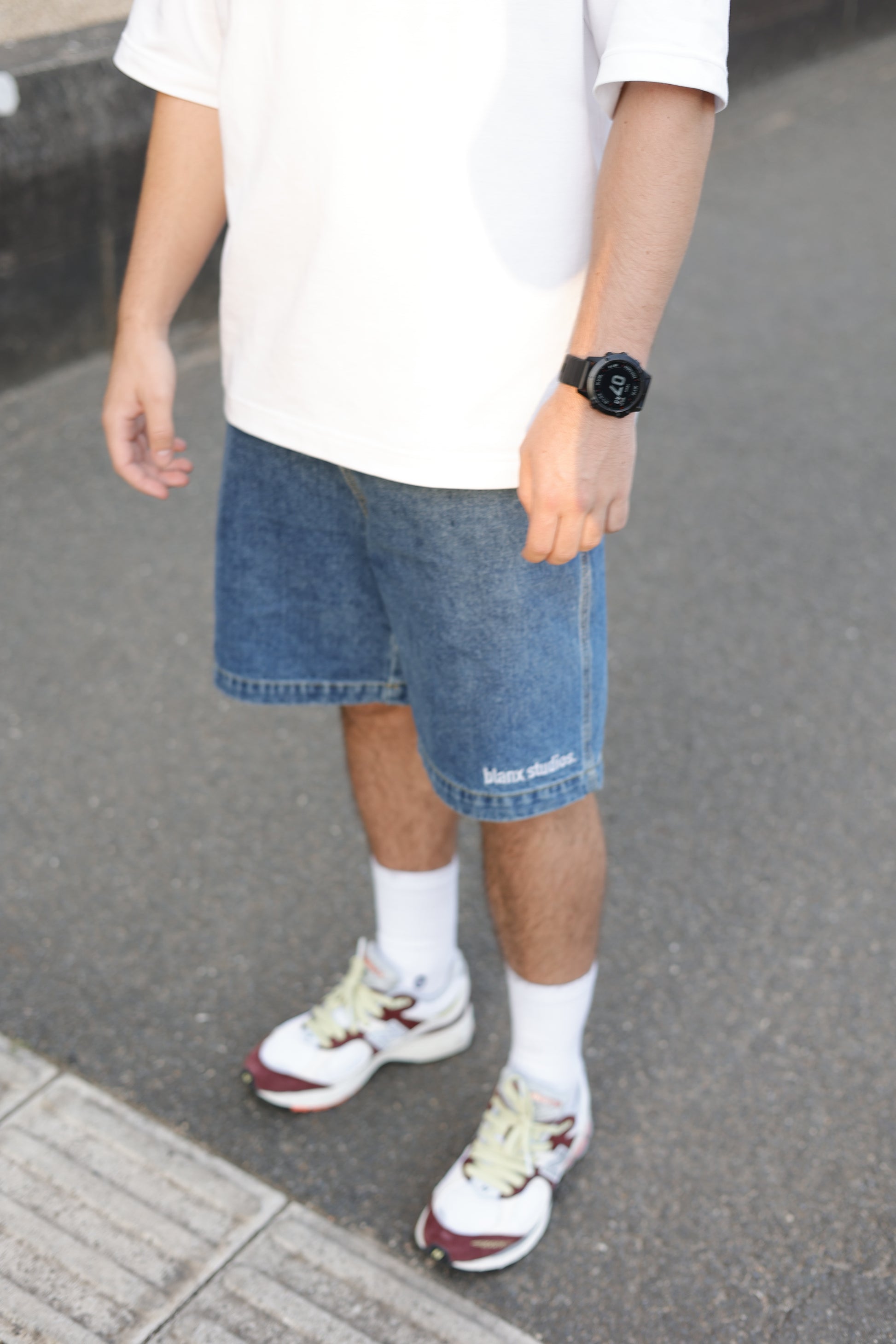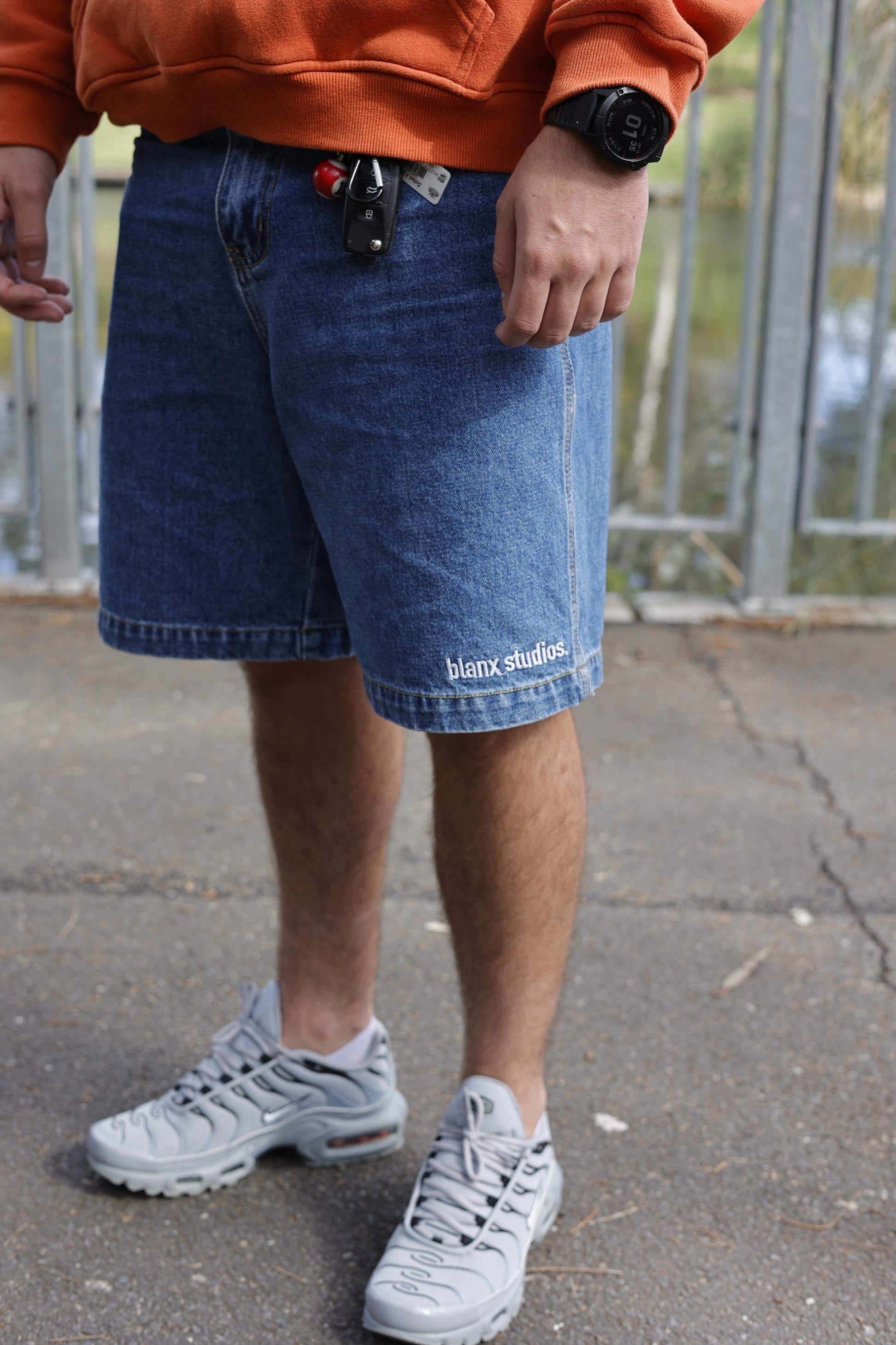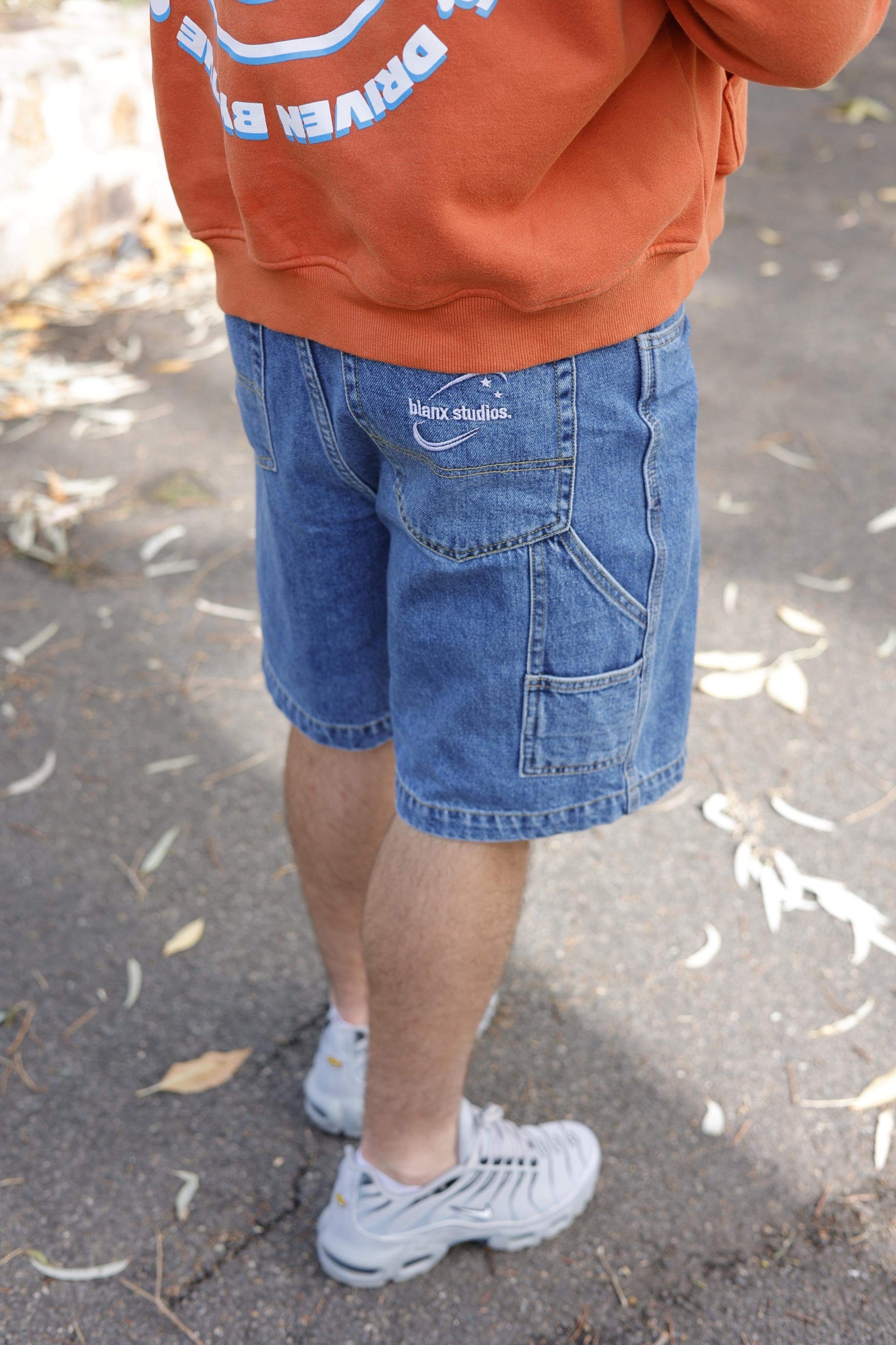 Blanx Studio Denim Carpenter Shorts. Each pair of shorts features custom embroidery and button, and key chain holder.