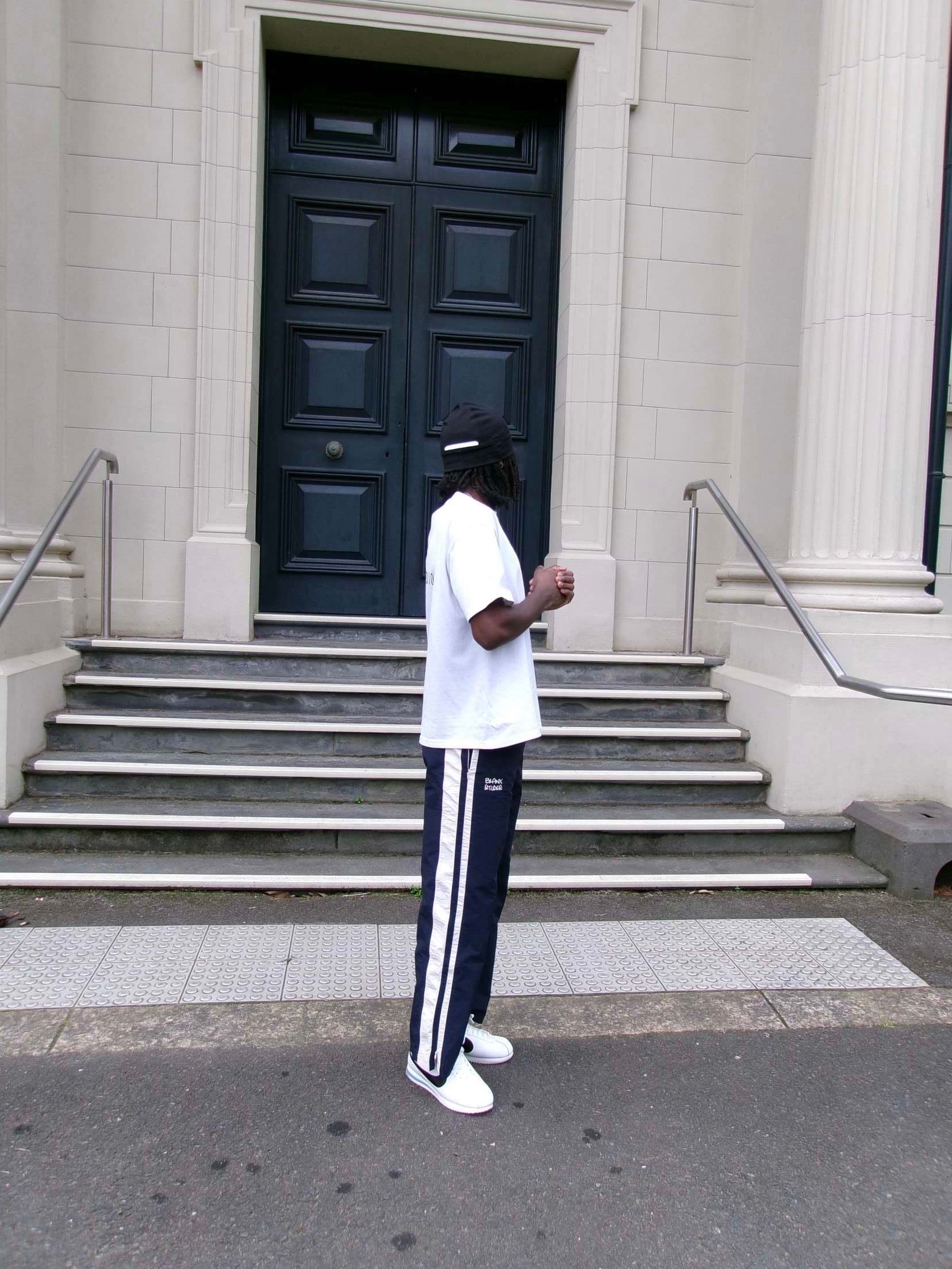 Our navy and cream 'Sports Tech Trackies'. Crafted from 100% nylon, features two zipped side pockets. One zip on each side at the outside at ankle height to adapt the effect of the end of the trousers. Elasticized waistband. And 'Blanx Studios' logo embroidered on the front.